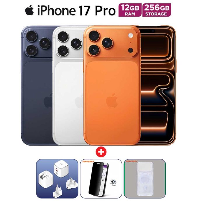 Apple iPhone 17 Pro 12GB RAM 256GB Mobile Phone 5G + Magsafe Shockproof Case + 4 Way Privacy Glass by Powerey + Super Fast Charger USB-A and USB-C 65W by LDNIO Bundle